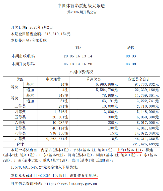 截止至10月8日,这位奉贤区的大奖得主仍未前往上海体彩中心兑奖。特别提醒,该期兑奖截止日为2025年10月9日,逾期将作为弃奖处理。